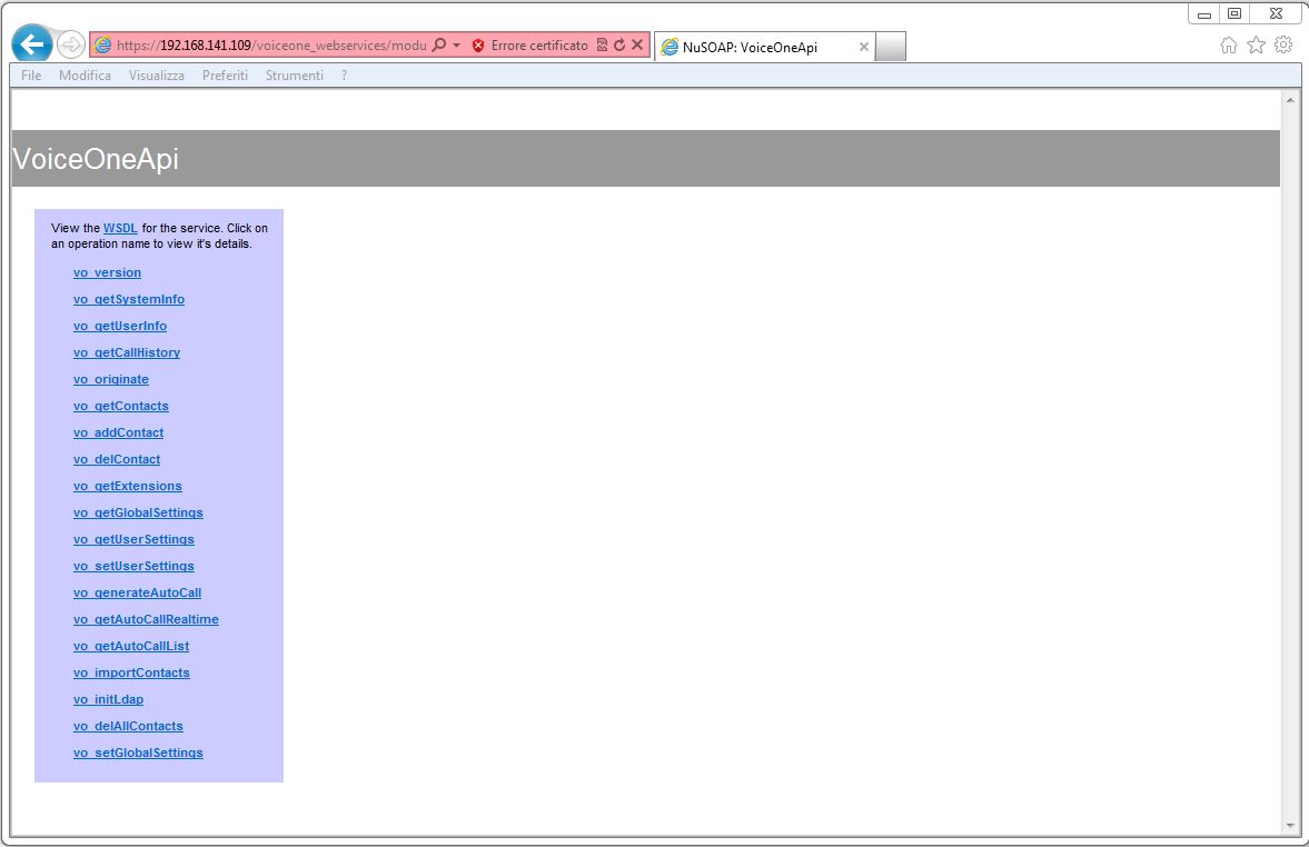 Il mdulo API permette a VoiceOne di pubblicare una serie di metodi che permetto a sistemi esterni di interagire con il centralino. L'interrogazione avviene attraverso l'uso di Web services SOAP che possono essere interrogati al fine di ricevere informazioni sulla configurazione e sullo stao del centralino e di interagire con i dati memorizzati su di esso come l'elenco delle chiamate e la rubrica. Attraverso le API è inoltre possibile lanciare comandi su VoiceOne realizzando funzionalità di click-to-call o di auto-call da un sistema esterno (gestionale, crm, ecc...) o dal desktop dell'utente.