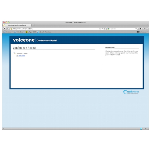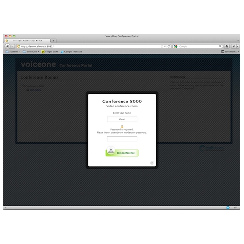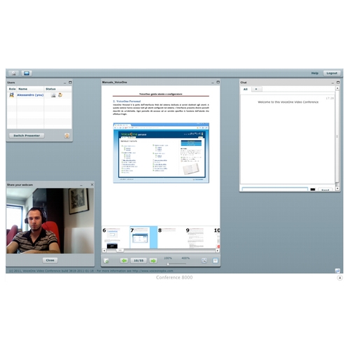 VoiceOne Video Conference è un modulo aggiuntivo che aggiunge un sistema di web conferencing alla tua installazione di VoiceOne e permette di fare presentazioni remote con slides, audio, video, chat e condivisione desktop. L'obiettivo degli sviluppatori del progetto open source originale è quello di poter iniziare una conferenza web semplicemente cliccando metaforicamente un grande bottone. E quello stesso obiettivo è stato riportato in questo modulo di VoiceOne. Il modulo supporta multiple sessioni audio/video, presentazioni con strumenti quali ad esempio il puntatore, lo zoom, la matita, chat pubbliche e private, condivisione desktop, audio integrato attraverso l'audio conferenza di VoiceOne, e il supporto per i documenti di Microsoft Office. Inoltre, gli utenti possono partecipare alla conferenza in due modalità: spettatore o presentatore.