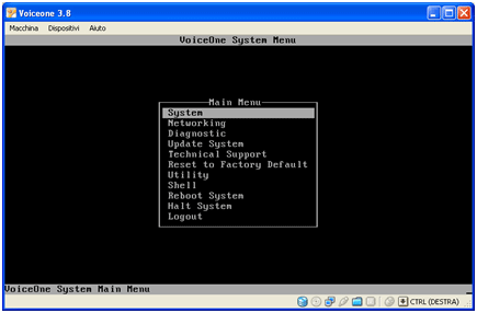 L'utente administrator ha accesso allo stesso menù dell'utente voiceone con in più l'aggiunta della voce "shell" che dà accesso di root alla shell comandi vera e propria. I parametri di accesso di default per questo utente sono: